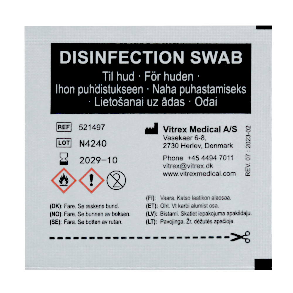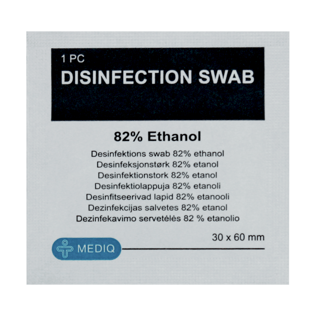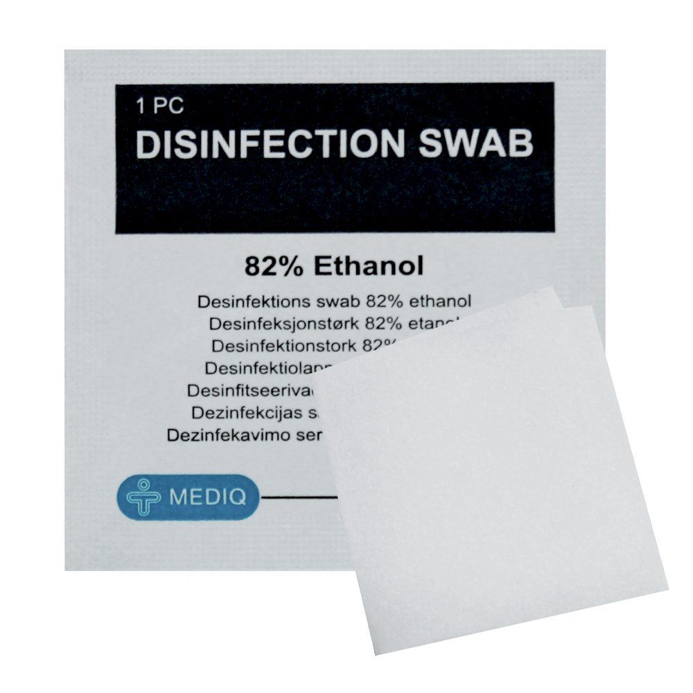 Single-packed disinfection swabs containing 82% ethanol, designed for effective skin cleaning prior to injection. Glycerol-free to prevent greasy residue, ensuring a clean and quick-drying surface.